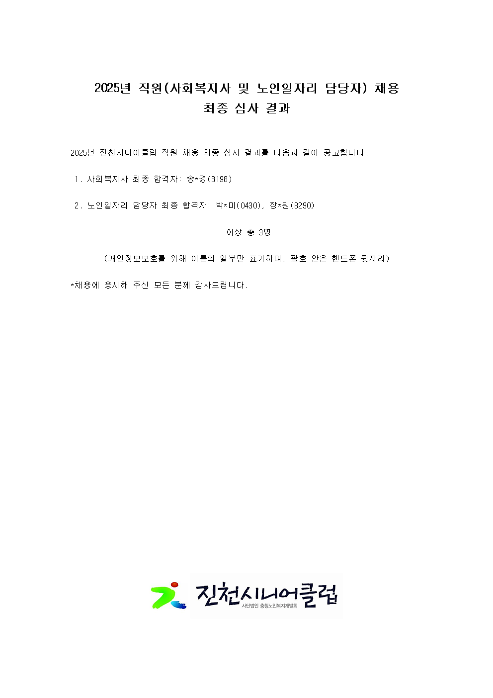 | 2025년 진천시니어클럽 직원(사회복지사 및 노인일자리 담당자) 채용 공고 최종 합격자 안내 | |||