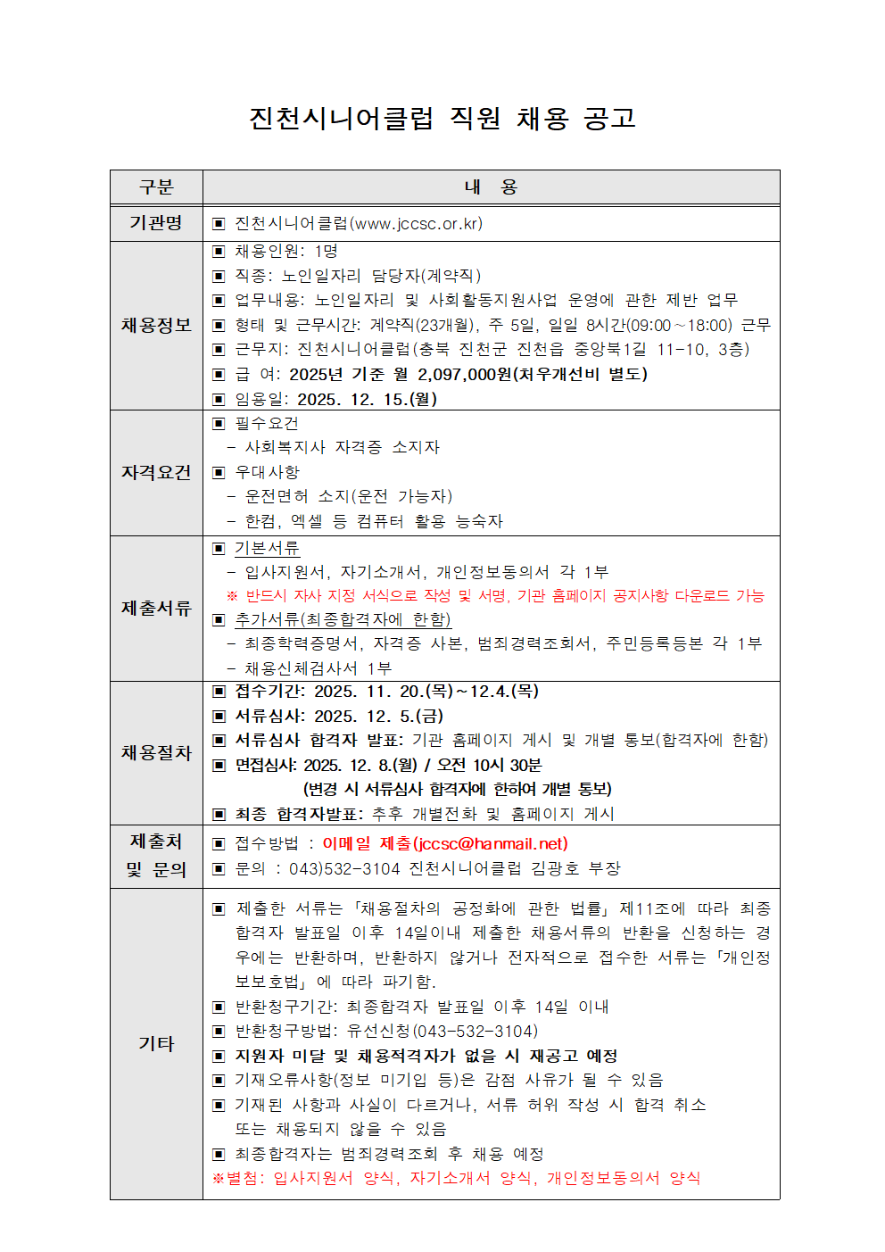 | 2025년 진천시니어클럽 직원(노인일자리 담당자) 채용 공고(12월) | |||