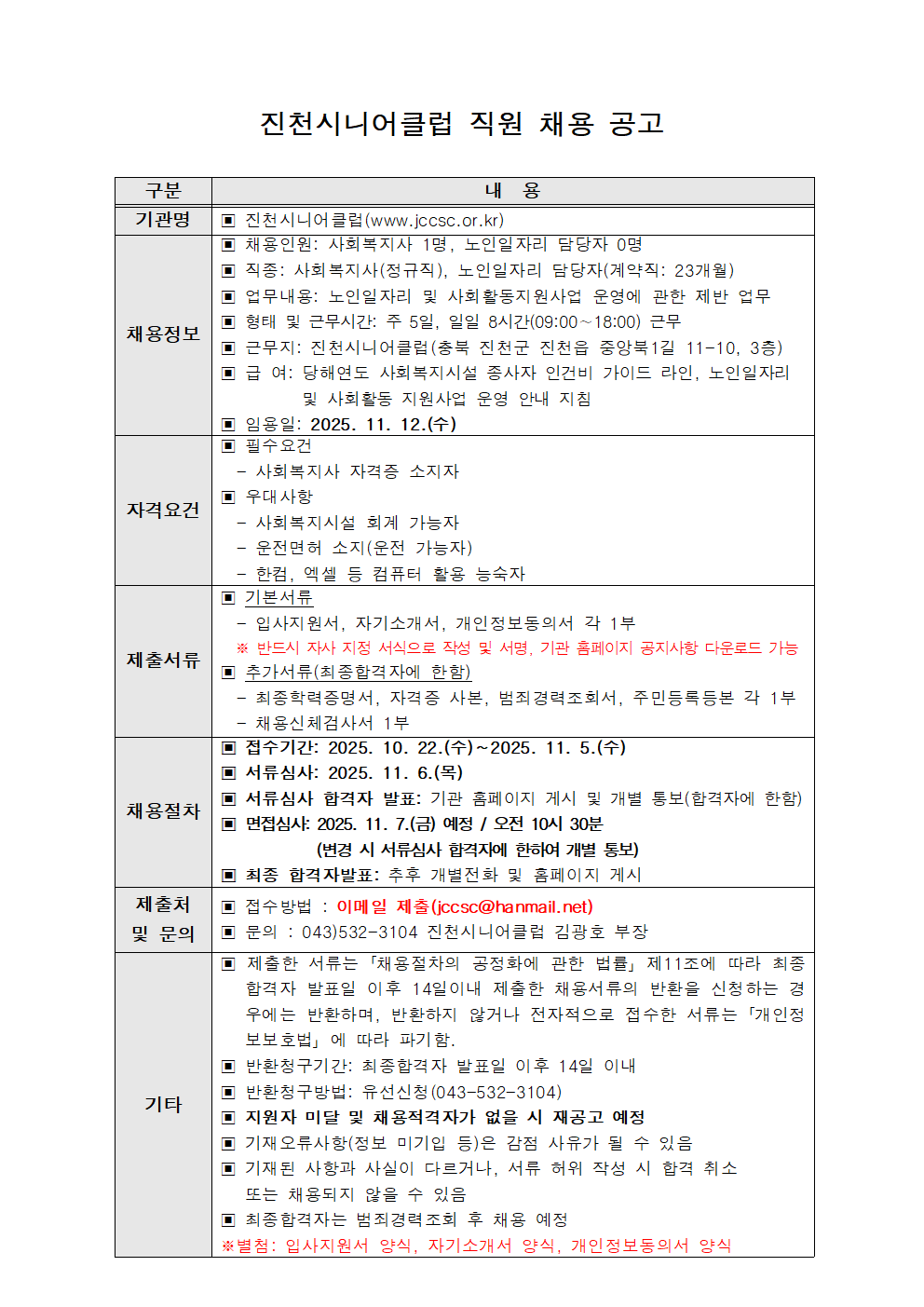 | 2025년 직원(사회복지사 및 노인일자리 담당자) 채용 공고 | |||
