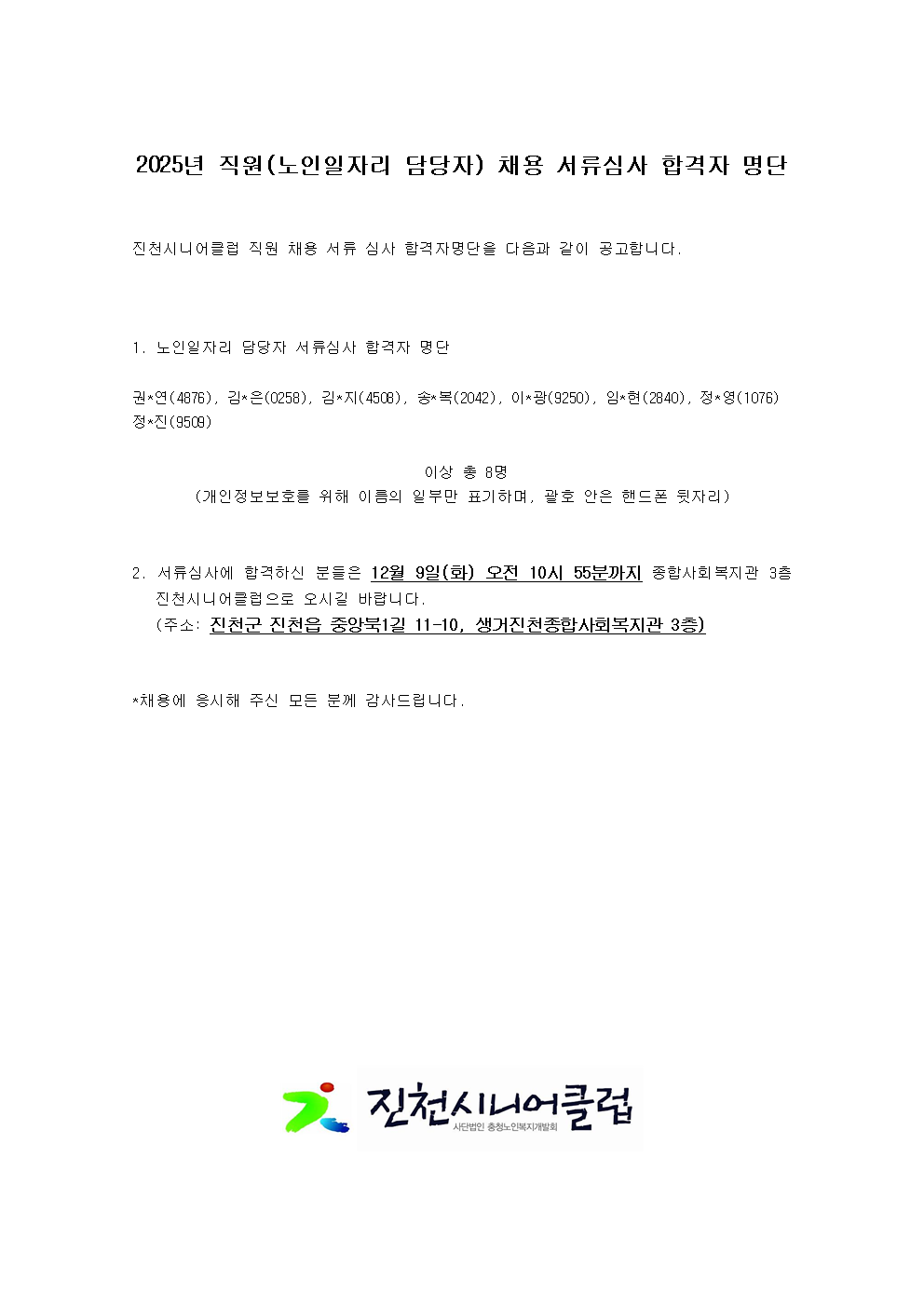 | 2025년 직원(노인일자리 담당자:12월) 채용 서류심사 합격자 명단 | |||