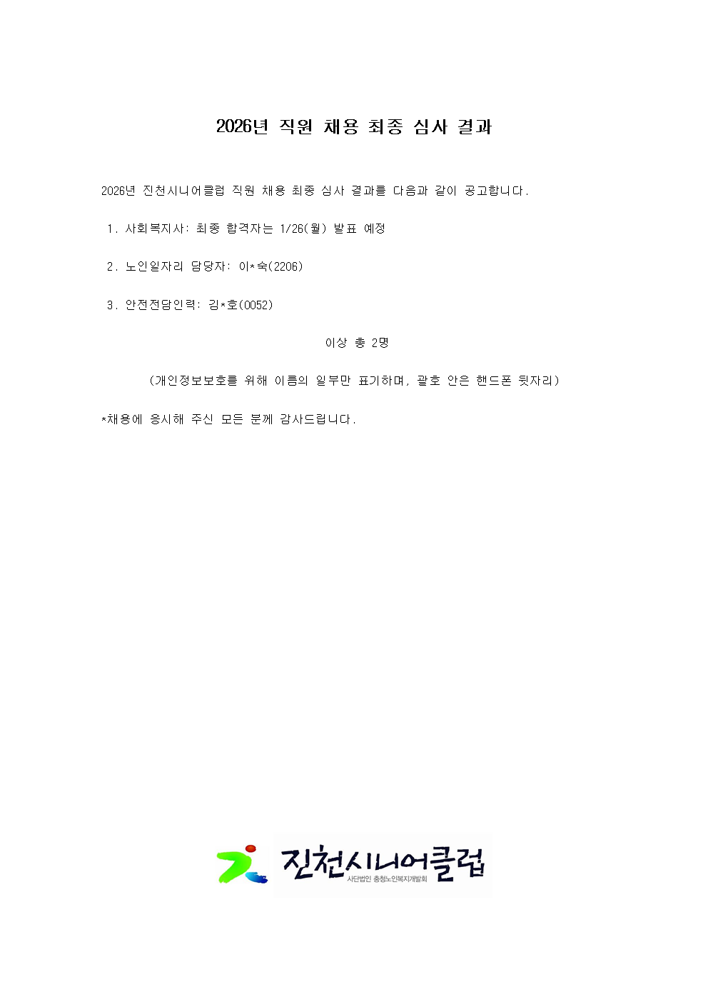 | 2026년 진천시니어클럽 직원 채용 최종 합격자 명단 안내 | |||
