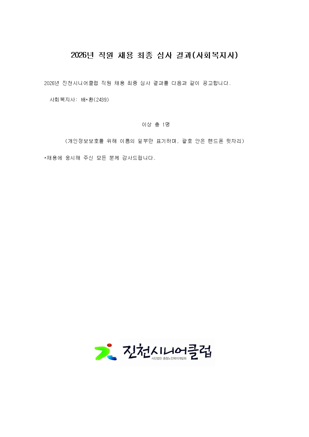 | 2026년 진천시니어클럽 직원(사회복지사) 채용 최종 합격자 명단 안내 | |||