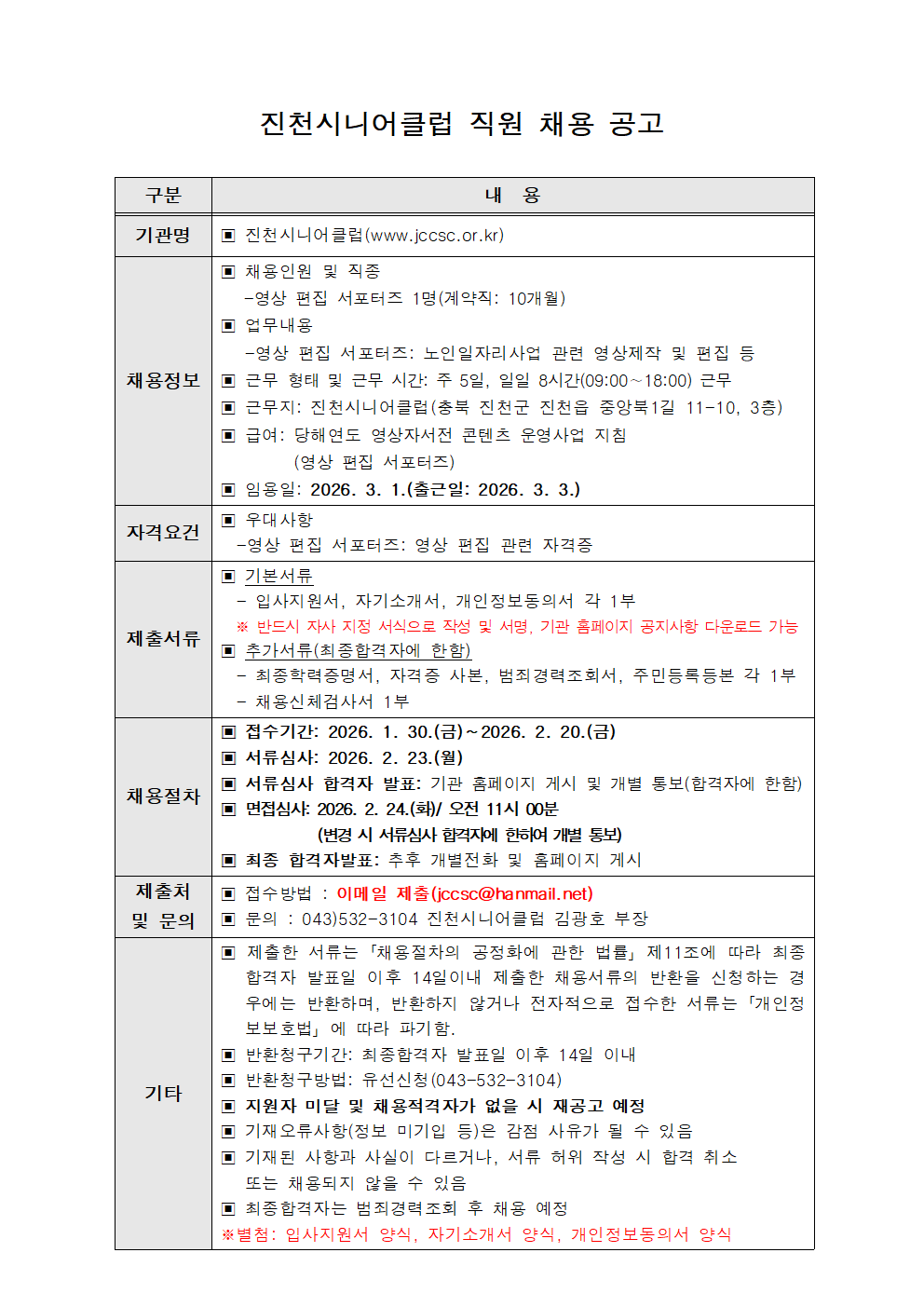 | 2026년 진천시니어클럽 직원(영상 편집 서포터즈) 채용 공고 | |||