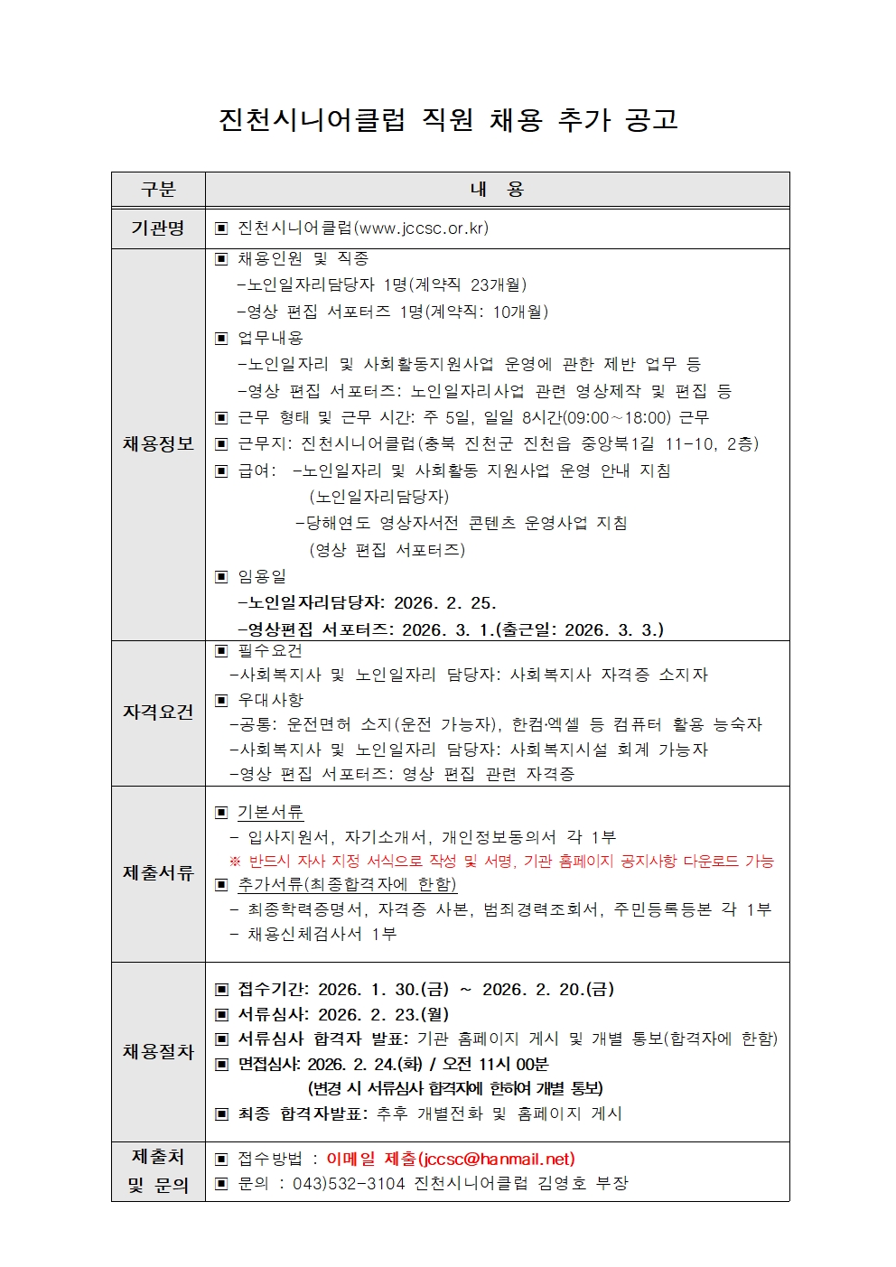 | 2026년 진천시니어클럽 직원 채용 추가 공고(2월) | |||